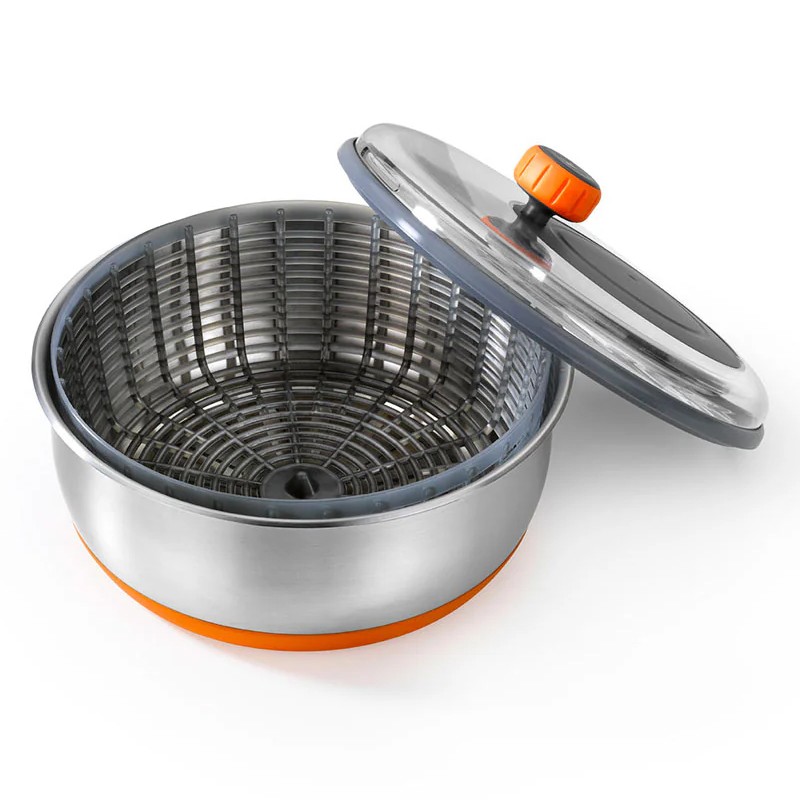 El centrifugador consta de un cuenco de acero inoxidable de 4 litros de capacidad con base antideslizante, una cesta de rejilla extraíble y una tapa transparente con pomo para girar la cesta, que facilita el centrifugado y secado de forma eficaz y sin esfuerzo de la lechuga y verduras recién lavadas.