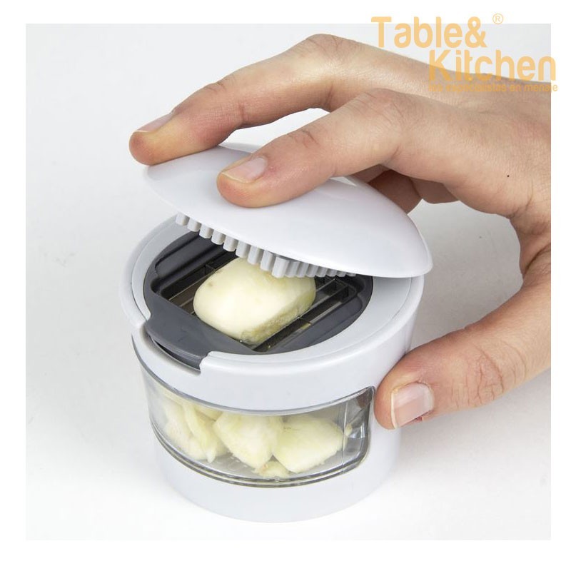 Prensa ajos con depósito extraíble que facilita la preparación del ajo de manera eficiente.