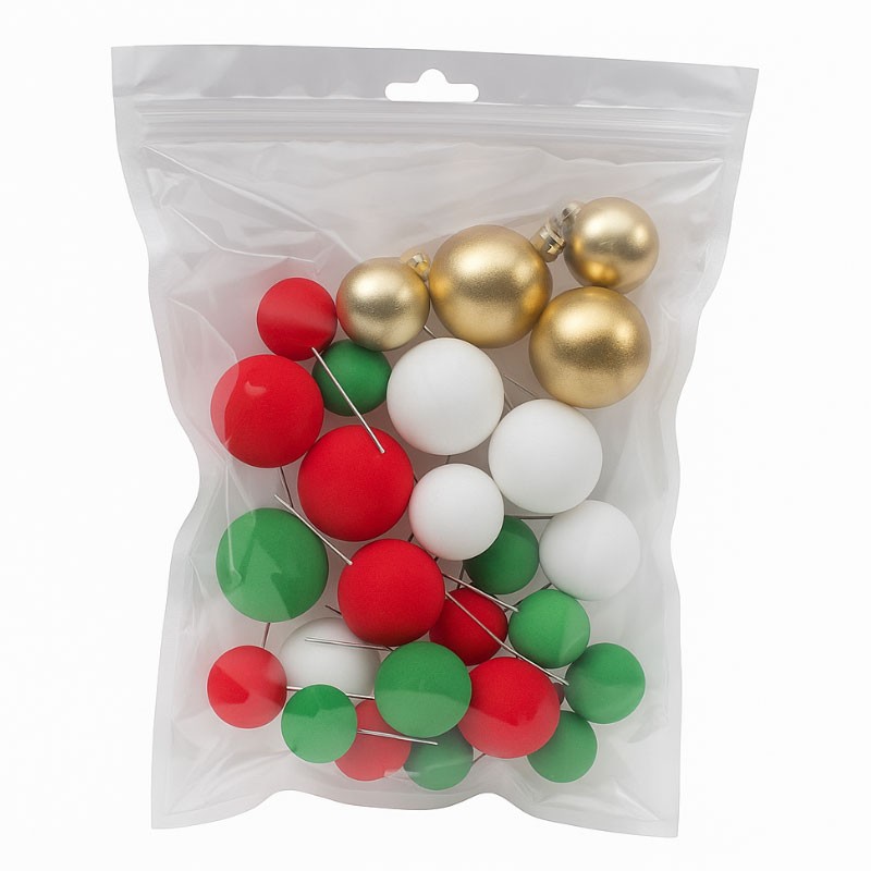 8 bolas de 2.5 cm (2 rojas, 2 verdes, 2 blancas, 2 doradas).