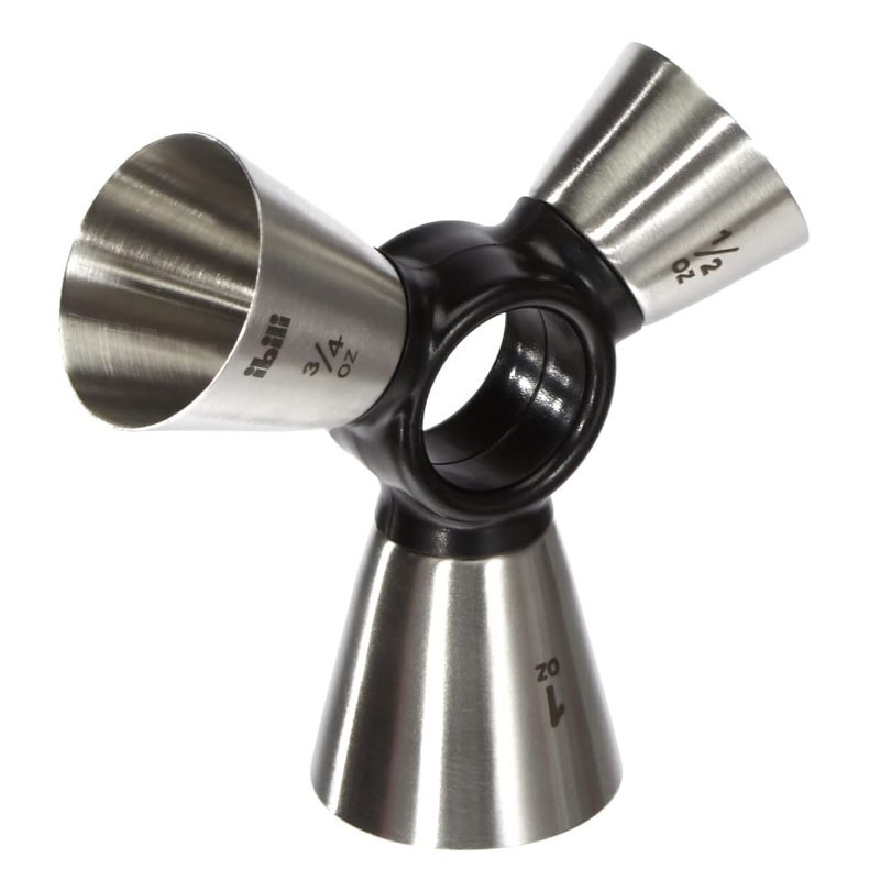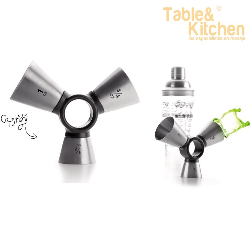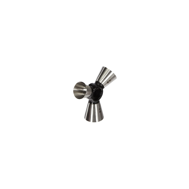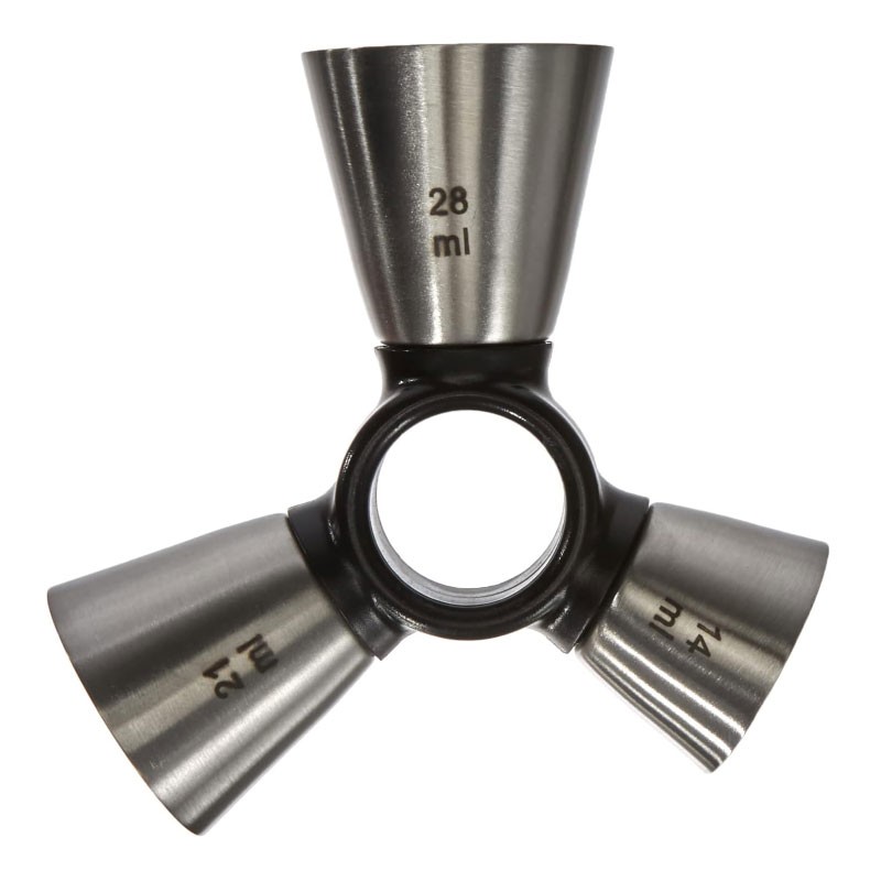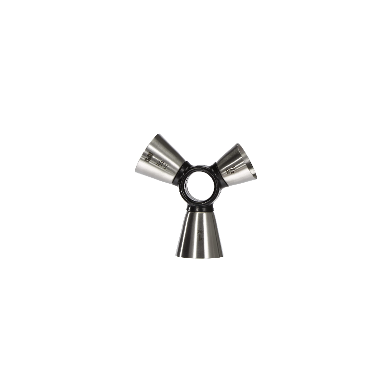 Medidor de licores triplo para coquetéis, fabricado em aço inoxidável.
