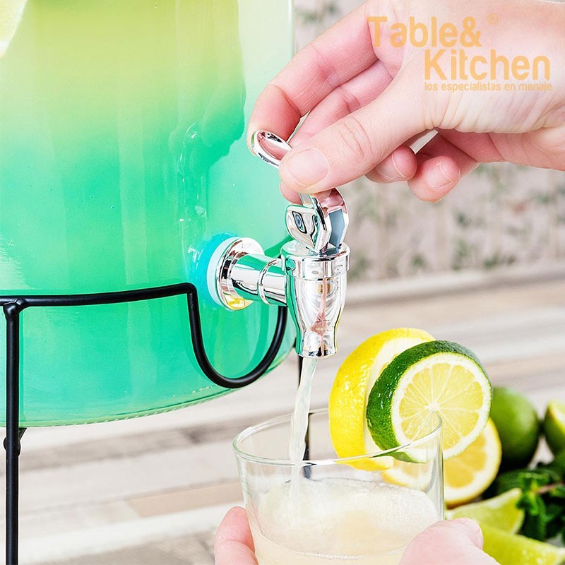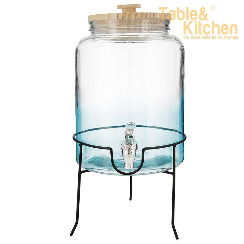Dosificador de grande capacidade fabricado em vidro. Com tampa de madeira e suporte elevado de metal. Cor degradê azul turquesa desde a base. 100% higiênico, reciclável, saudável e ecológico. Material não poroso de longa duração. Apto para entrar no frigorífico. Recomenda-se lavagem e secagem à mão para uma conservação ótima e duradoura, embora o corpo sem torneira nem tampa possa ser lavado na lava-louças. Transportável.