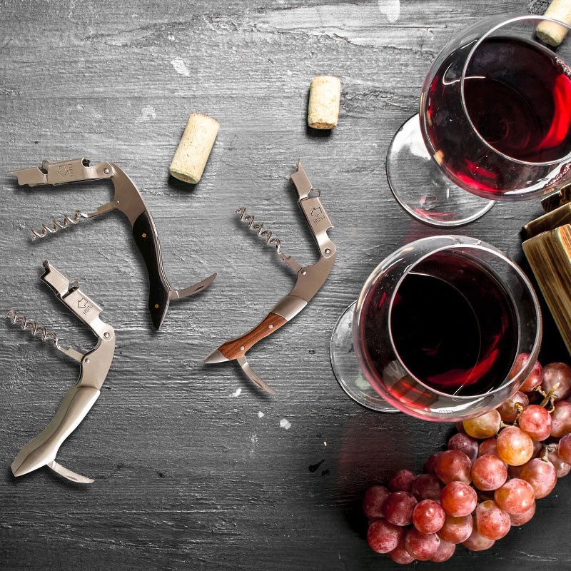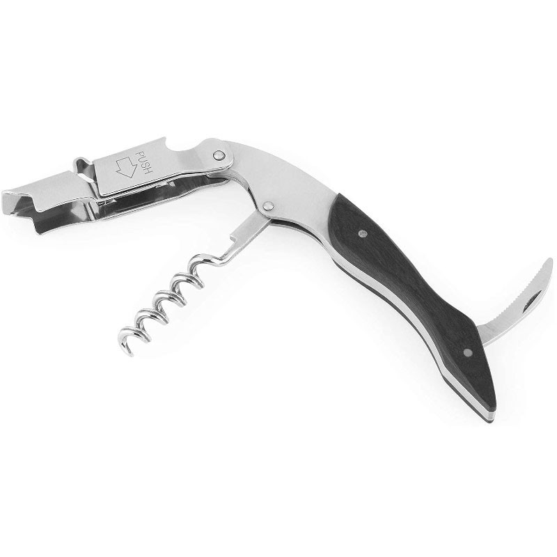 Sacacorchos camarero modelo Ego de Boj com 3 ferramentas essenciais: bico, lâmina e espiral. Este sacacorchos é elegante e leve, ideal para abrir garrafas de forma eficiente.