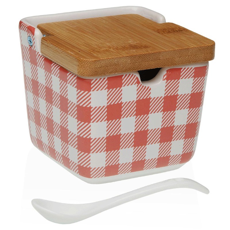 Um açucareiro cerâmico com estampa vichy vermelha e colher que traz tradição, cor e design próprio à sua cozinha.