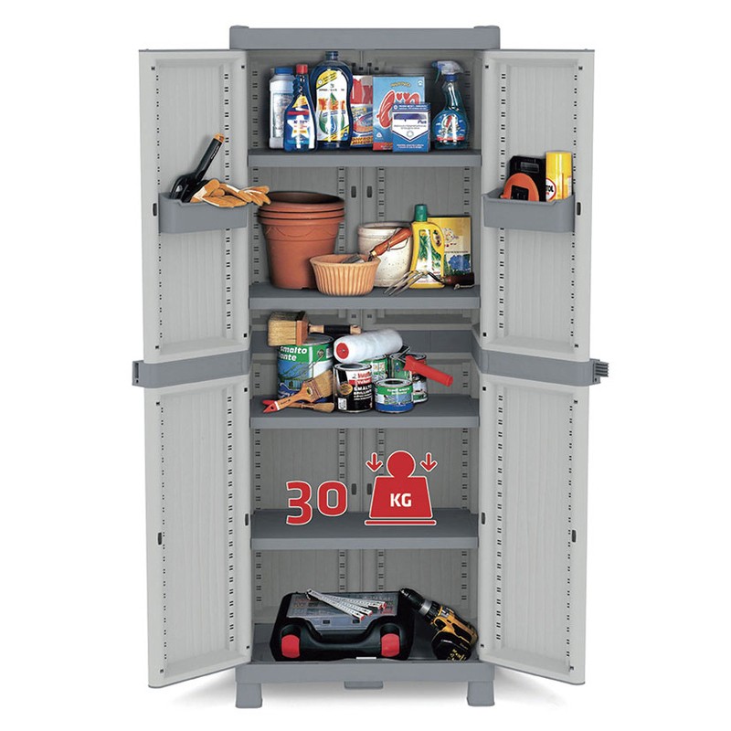Armário multiuso de design robusto e resistente que pode ser colocado tanto em interiores como em exteriores. É fabricado em polipropileno, um material plástico resistente às intempéries. Possui 4 prateleiras que podem ser ajustadas em altura e suportam um peso máximo de 30 Kg. Vem desmontado em uma caixa e você mesmo pode realizar a montagem de forma simples.