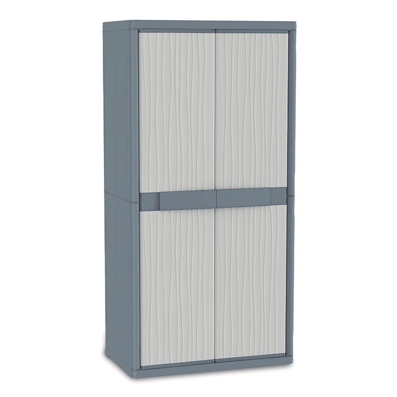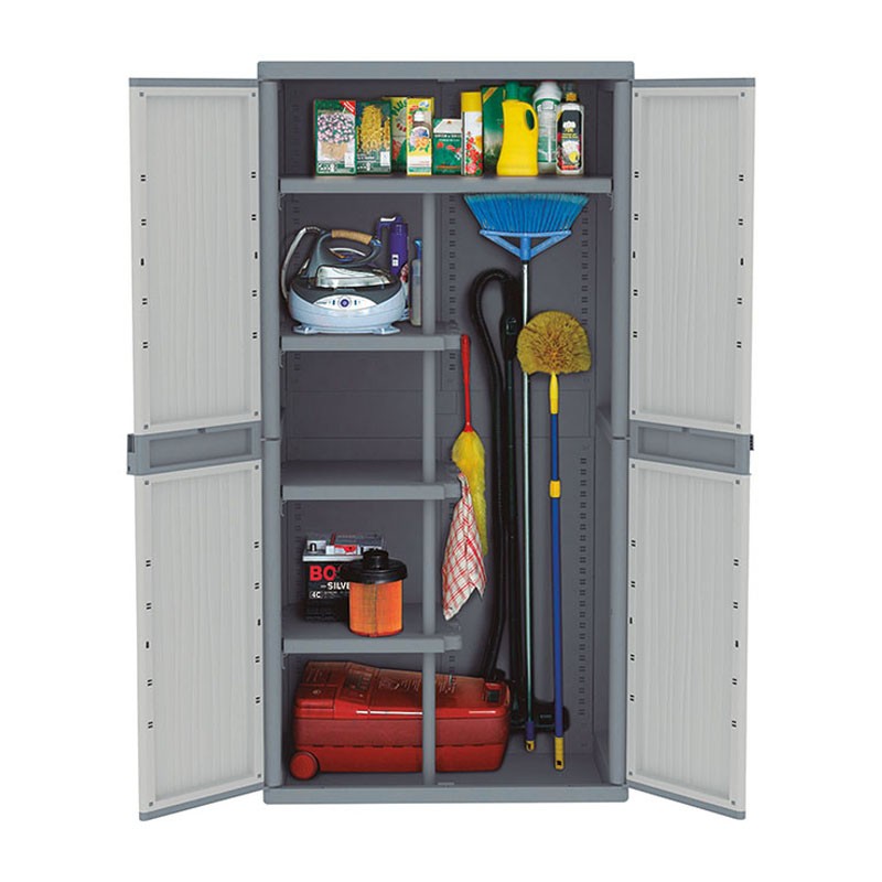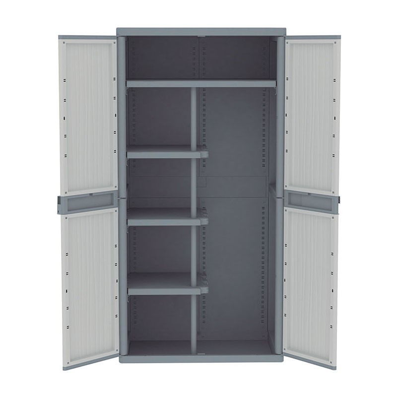 É um armário multiuso de design robusto e resistente que pode ser colocado tanto em interiores como em exteriores. É fabricado em resina, um material resistente às intempéries. Possui 4 prateleiras que suportam um peso máximo de 30 Kg.