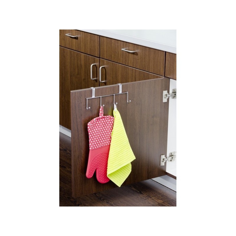 Cabideiro com 4 ganchos projetado para uso em portas e gavetas, ideal para pendurar panos, luvas e outros utensílios.