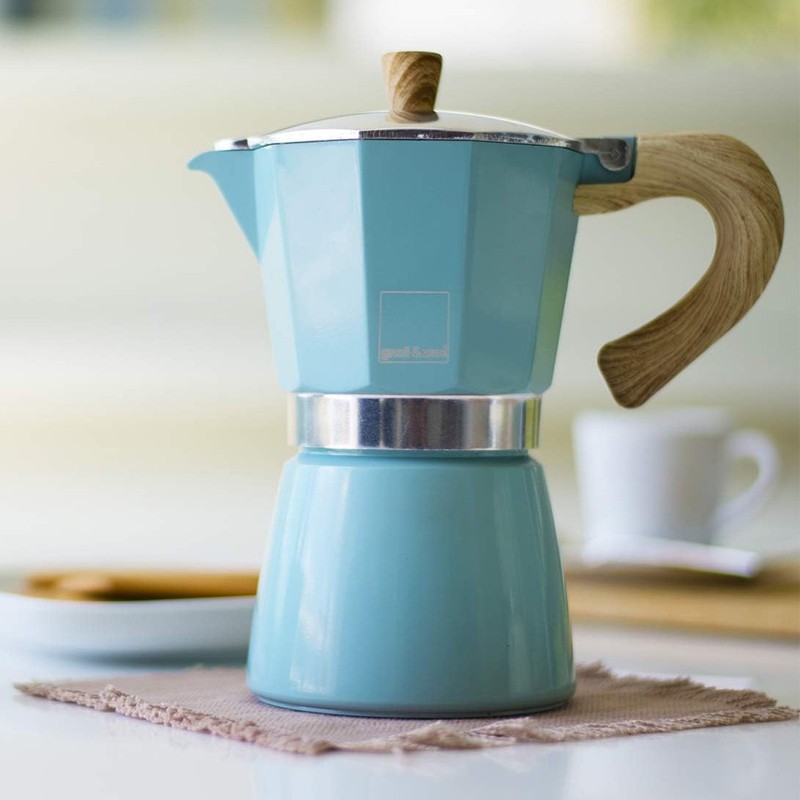 É uma cafeteira italiana muito elegante e até decora o lugar onde é colocada.