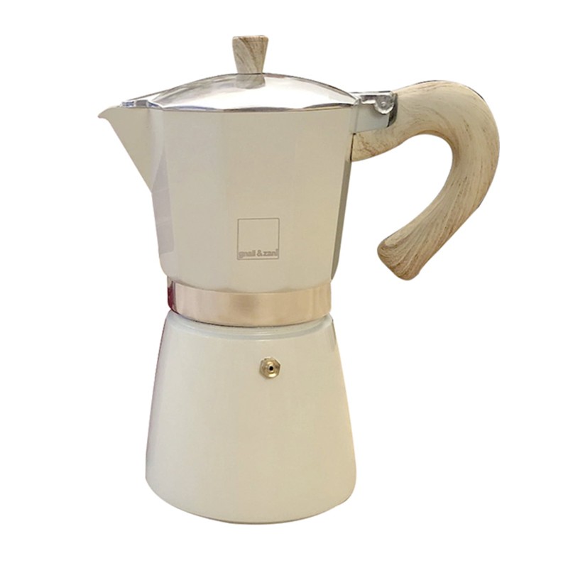 Cafeteira italiana fabricada em alumínio e aço inoxidável.