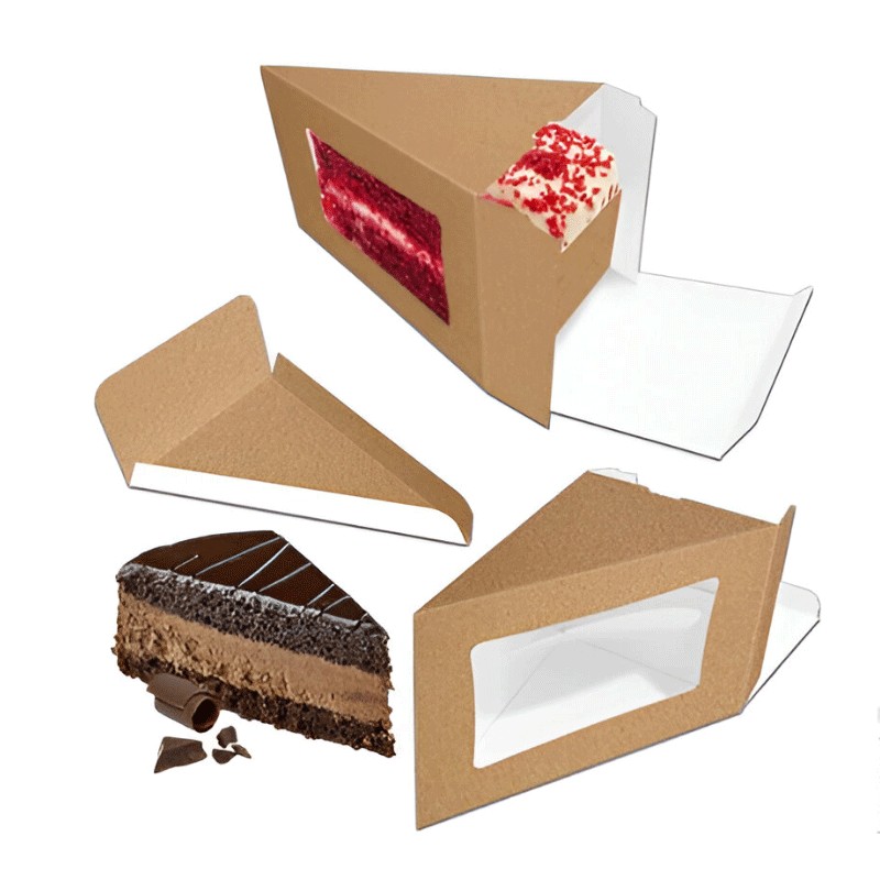 Caixa kraft com janela e base, ideal para porções individuais de bolos, sobremesas ou pizzas, com design prático, resistente e de apresentação profissional.