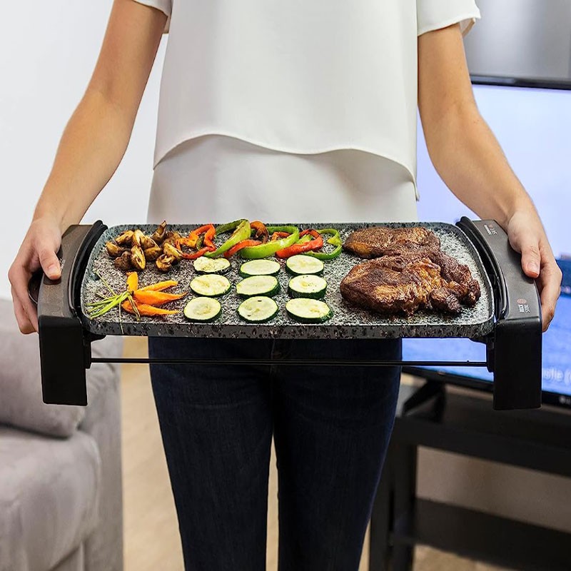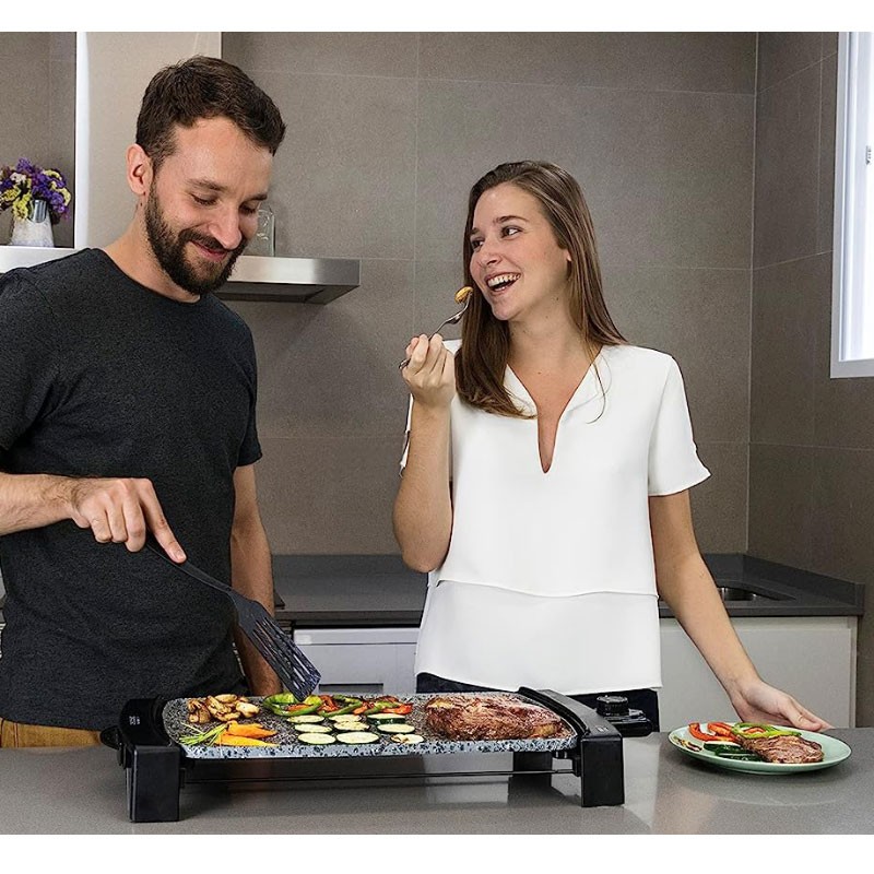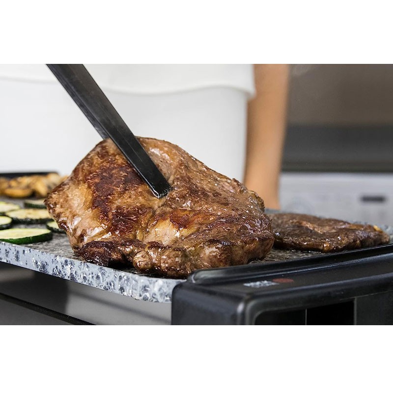 Chapa de assar elétrica de grande potência com revestimento de pedra RockStone, termômetro regulável e apta para lava-louças. 45x25 cm. Rock&Water 2500.