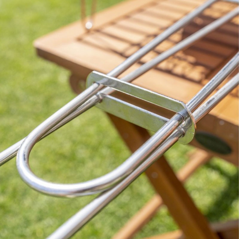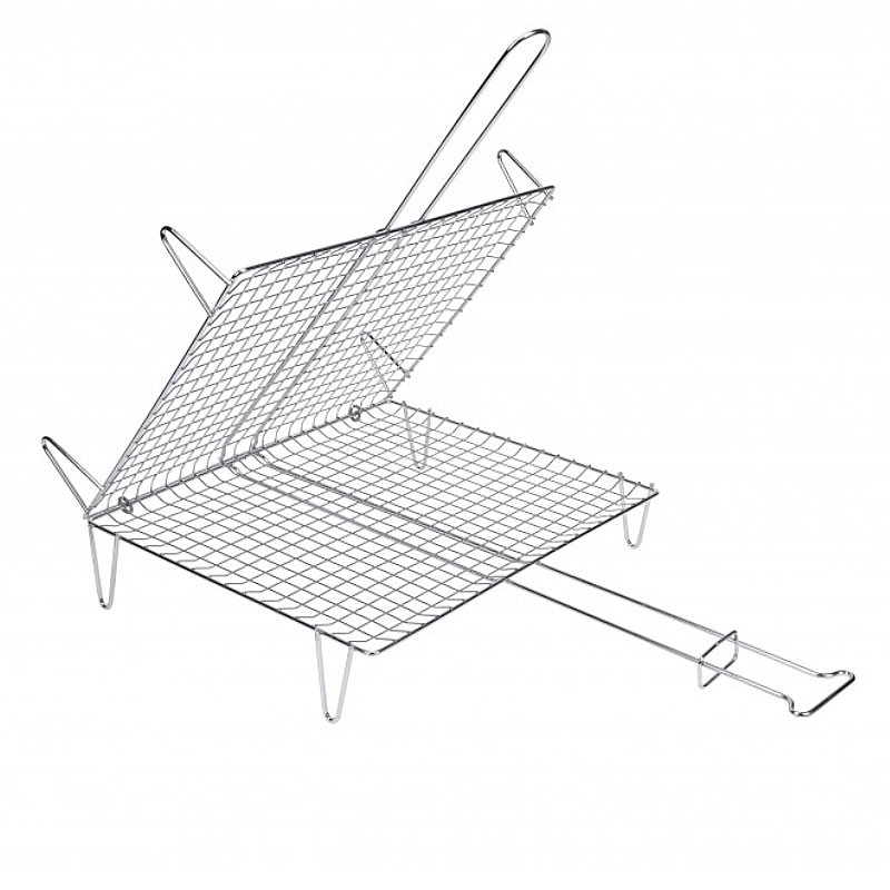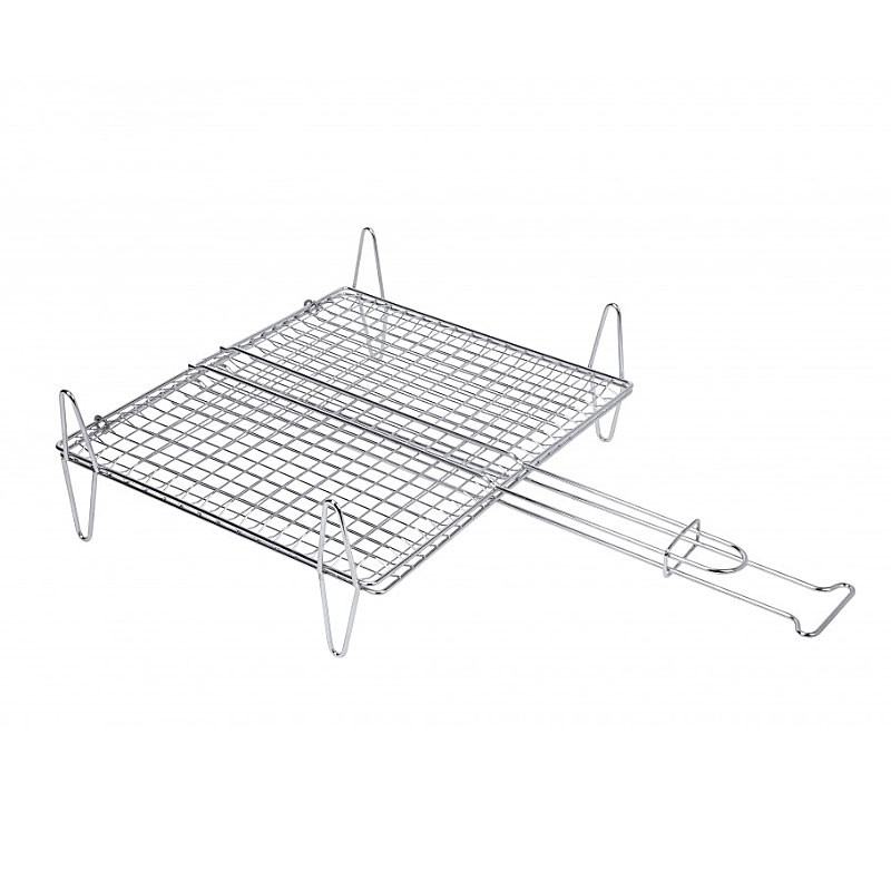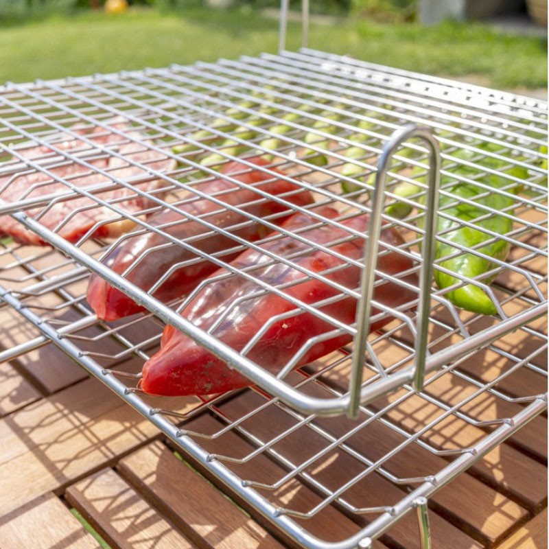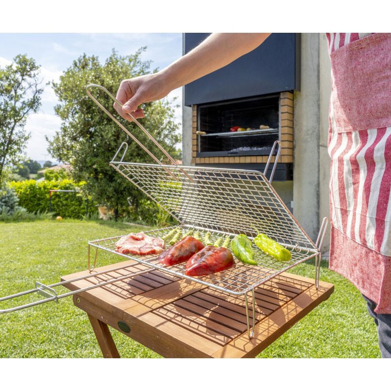 Grelha dupla abombada e quadriculada que permite uma cozedura cómoda e segura de todo tipo de comida (peixe, carne, verduras, etc.).