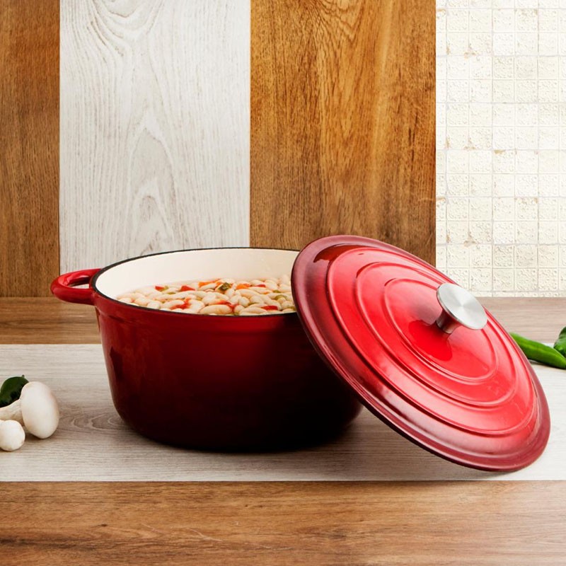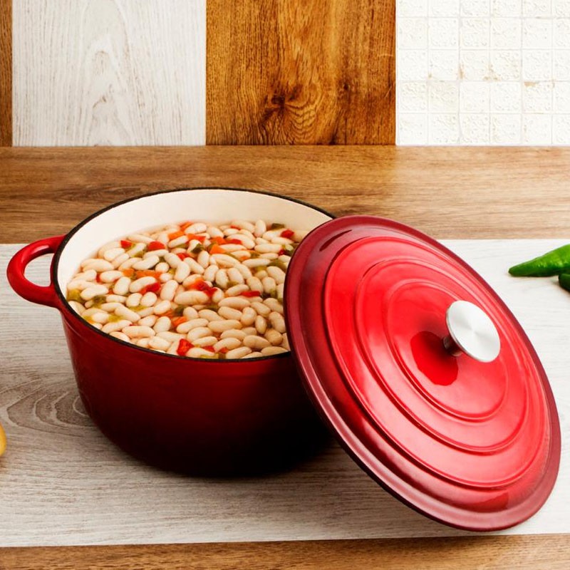 O ferro fundido esmaltado é uma liga rica em carbono revestida com esmalte, composta principalmente de vidro. É um dos materiais que melhor retém o calor, difundindo-o lentamente e distribuindo-o uniformemente por seu interior. Também é adequada para todos os tipos de fontes de calor: forno, gás, lareira a lenha, carvão, vitrocerâmica, eletricidade sólida ou radiante e até mesmo fogões de indução.