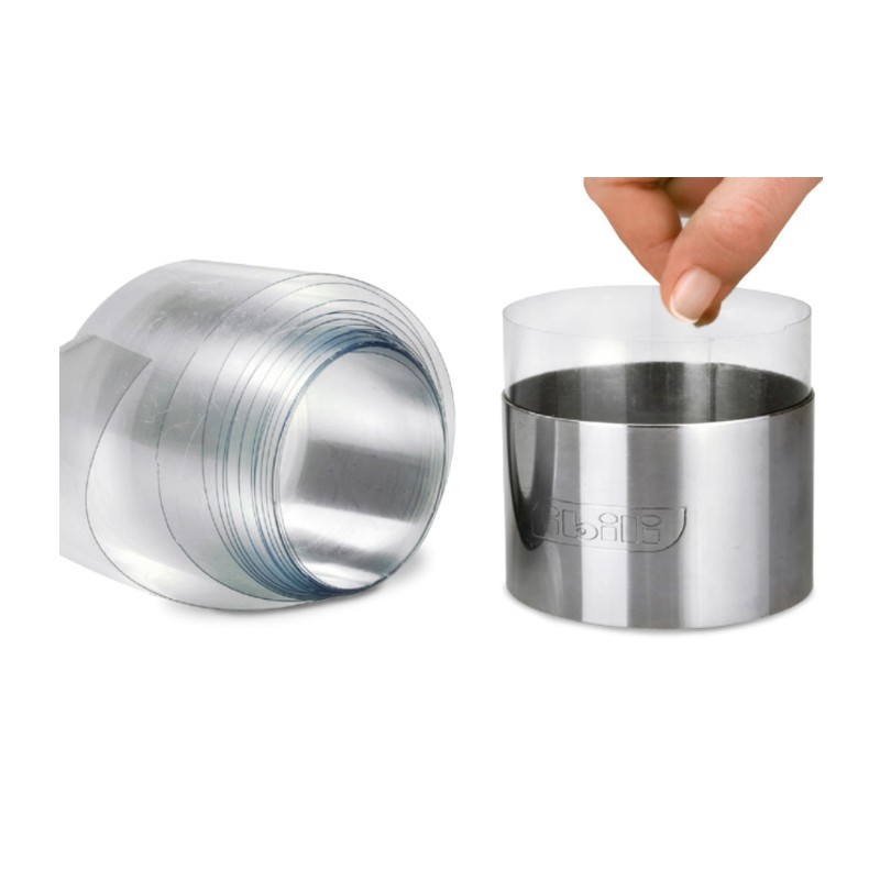 Rolo de acetato para confeitaria, 20 metros de comprimento por 4,5 cm de altura. Fabricado em PVC.