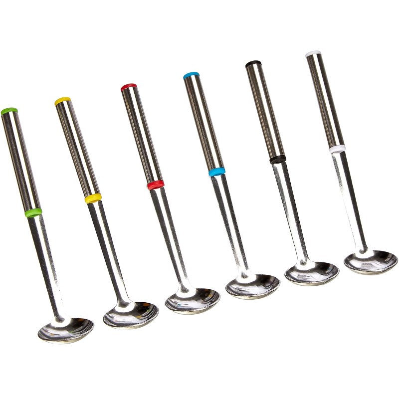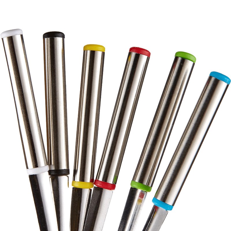 Jogo de 6 colheres de aço inoxidável para fondue, com pontas coloridas para fácil identificação.