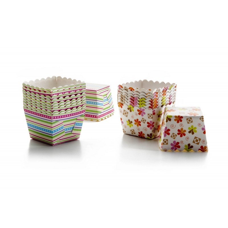 Conjunto de 20 cápsulas de papel Primavera, projetadas para assar bolinhos ou muffins com formato quadrado. Essas cápsulas são altamente resistentes e impermeáveis à gordura, além de estarem decoradas com listras e flores.