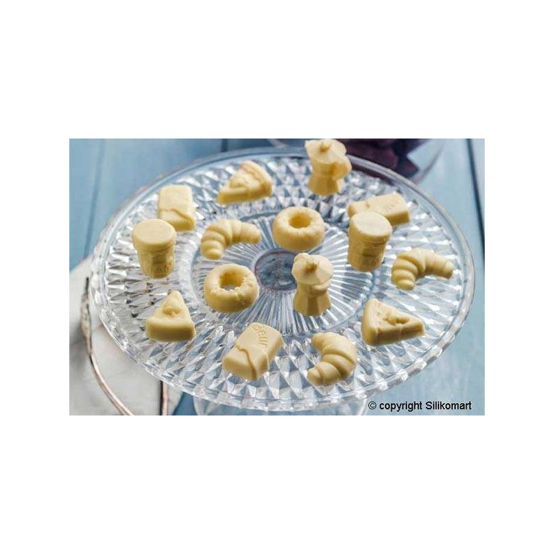Molde fabricado em silicone Platinum 100% para fazer bombons com forma de fatia de bolo, cafeteira, croissant, donut, manteiga e geleia.