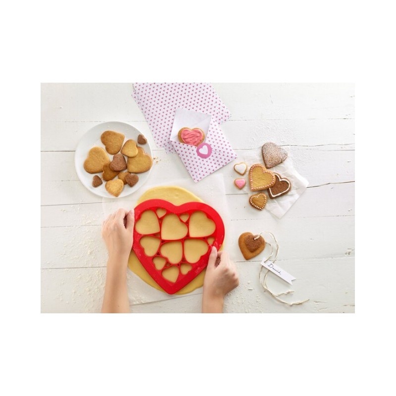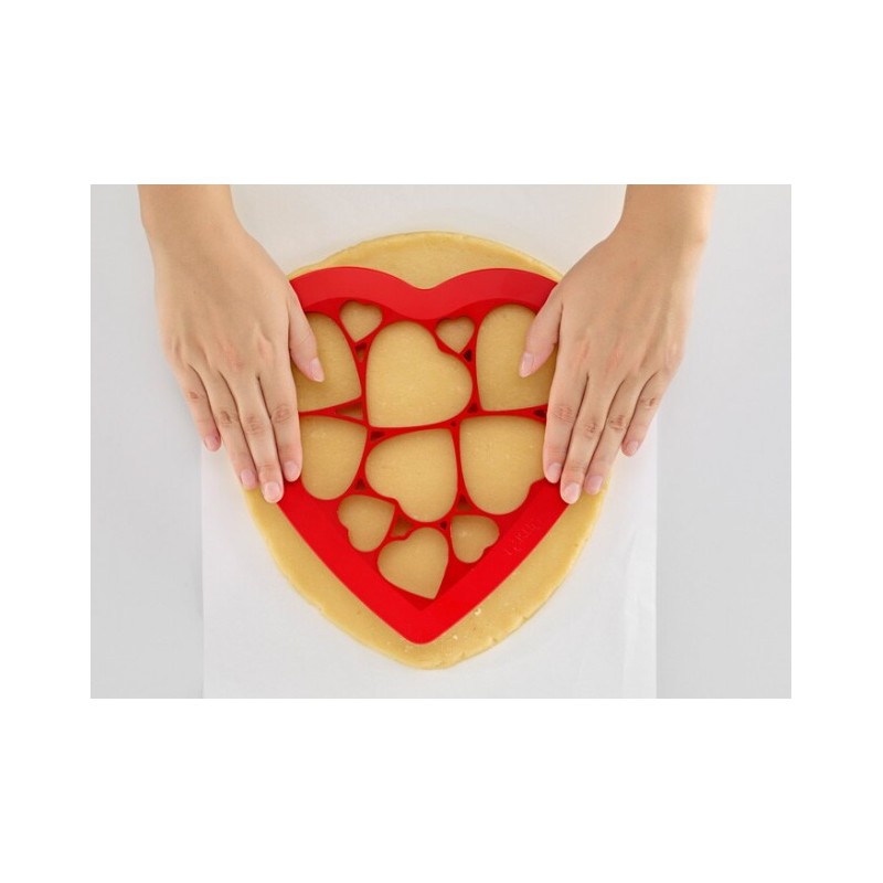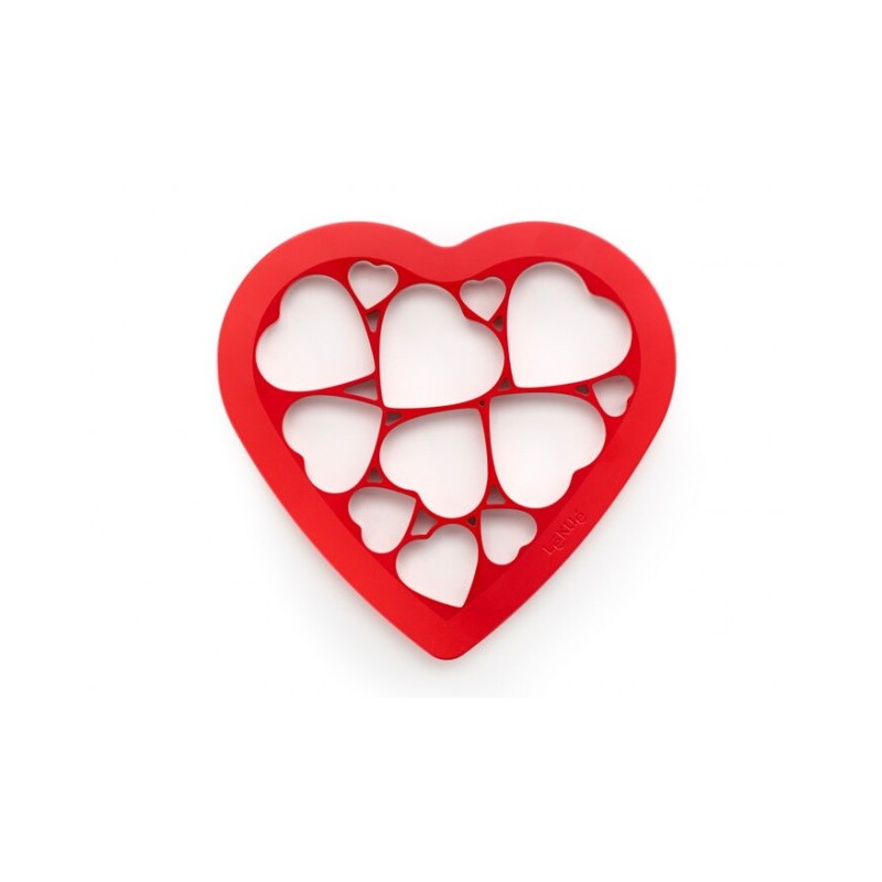 O COOKIE PUZZLE CORAÇÃO LEKUE é uma forma rápida, simples e original de presentear corações. Este molde único conta com 12 figuras de coração nele, permitindo que você as coloque sobre a massa de uma só vez e as tenha prontas para levar ao forno.