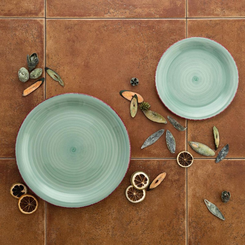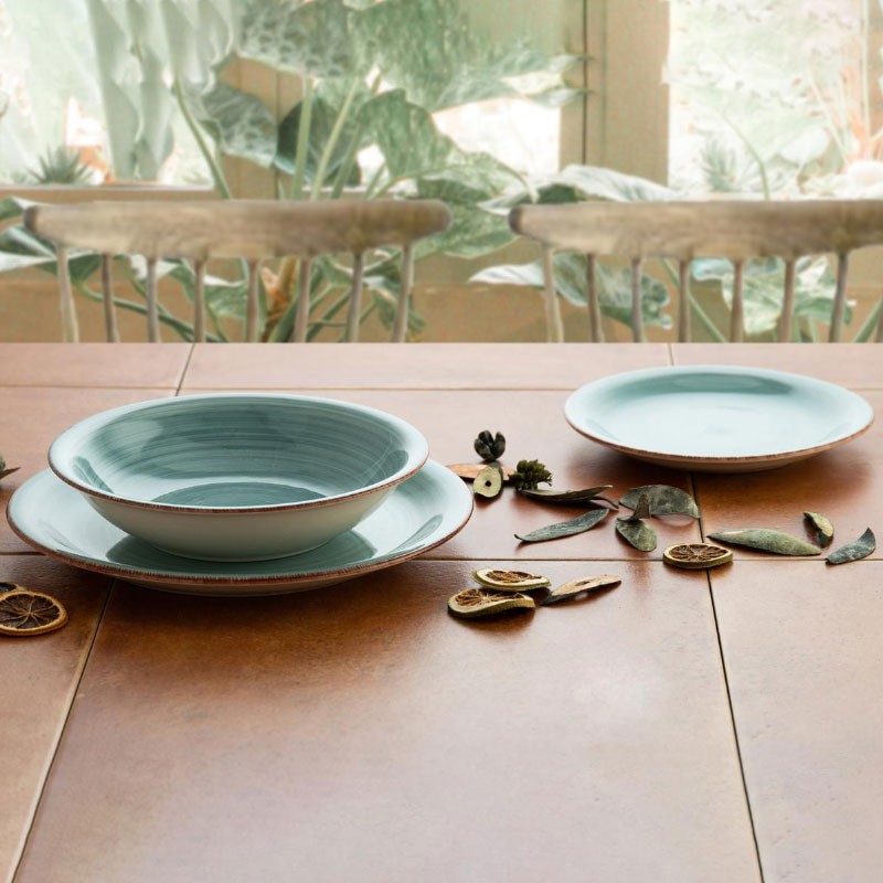 Louça modelo Aqua Vita da Quid, fabricada em grés. Composta por 6 pratos rasos, 6 pratos fundos e 6 pratos de sobremesa.