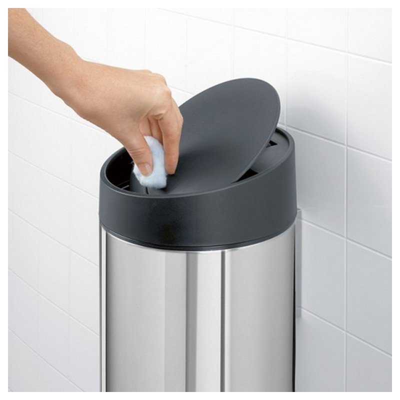 Lixeira com tampa oscilante Brabantia que se abre facilmente com um único movimento de mão e se fecha automaticamente de forma silenciosa, graças ao seu sistema único e patenteado de abertura e fechamento. A tampa desliza para dentro e para cima, o que reduz a possibilidade de tocar o conteúdo.