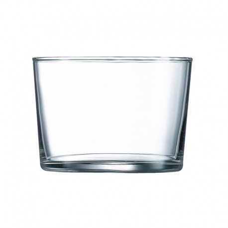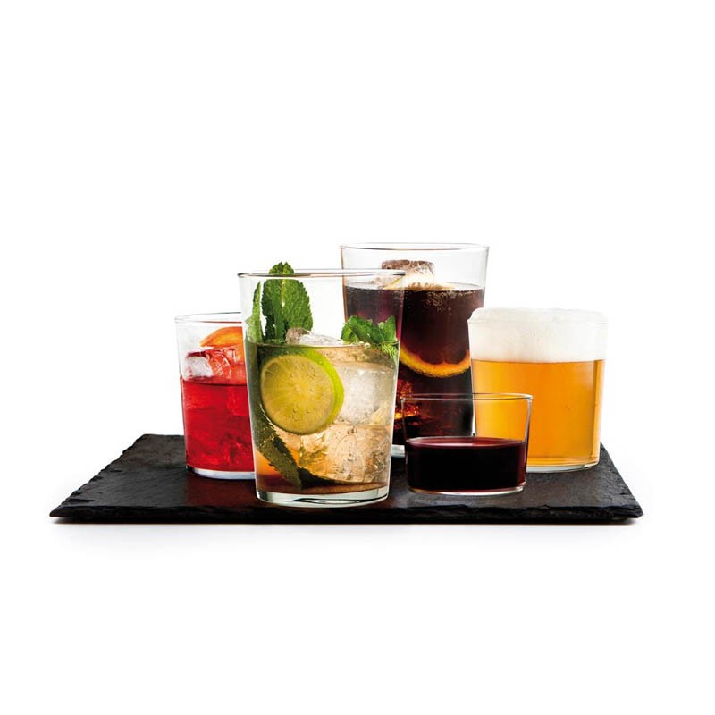 Caixa com 4 copos de vidro de 23cl, normalmente conhecidos como copinhos. Simples, fácil de empilhar e limpar na máquina de lavar louça.