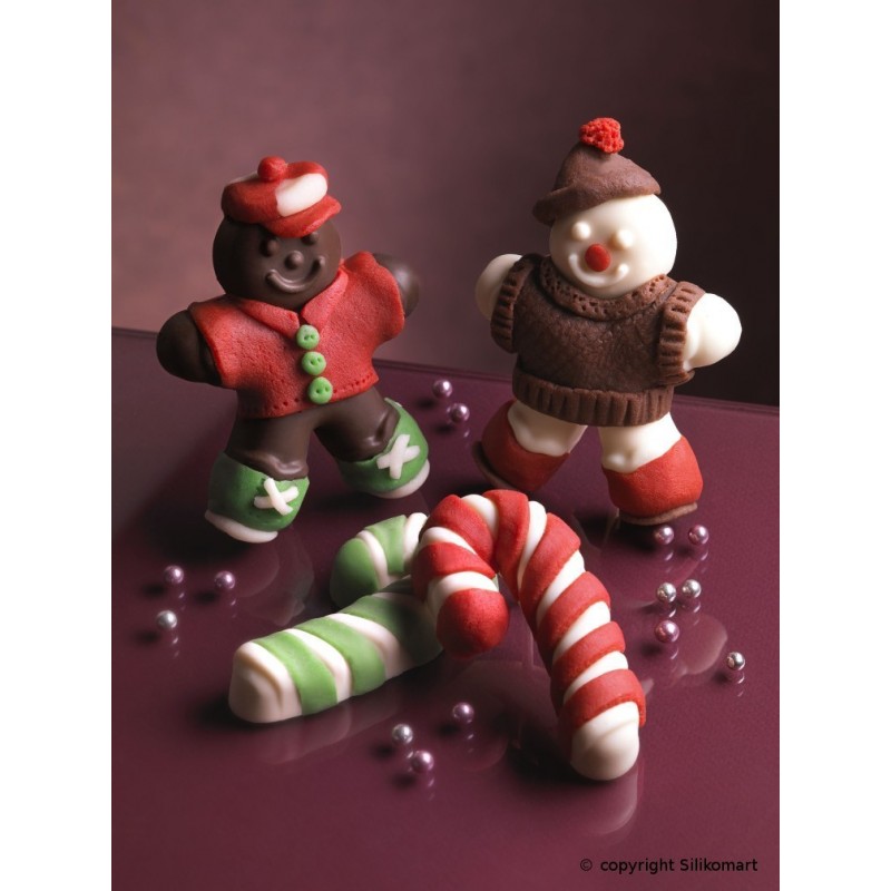 Molde para fazer qualquer tipo de sobremesa com formas de boneco de gengibre e bastões de Natal. Fabricado em silicone. Apto para forno, micro-ondas e lava-louças.