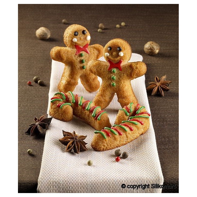 Molde de silicone para fazer sobremesas natalinas com forma de boneco de gengibre e bastão de Natal.