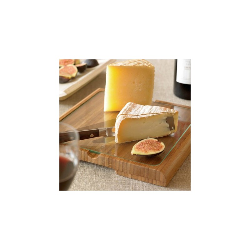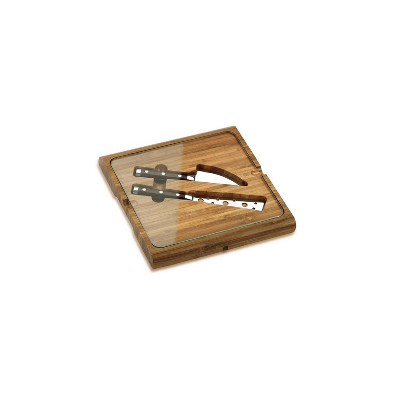 Elegante tábua para degustação de queijos composta por uma tábua de bambu com vidro na parte que são servidos os queijos e duas facas de aço inoxidável.