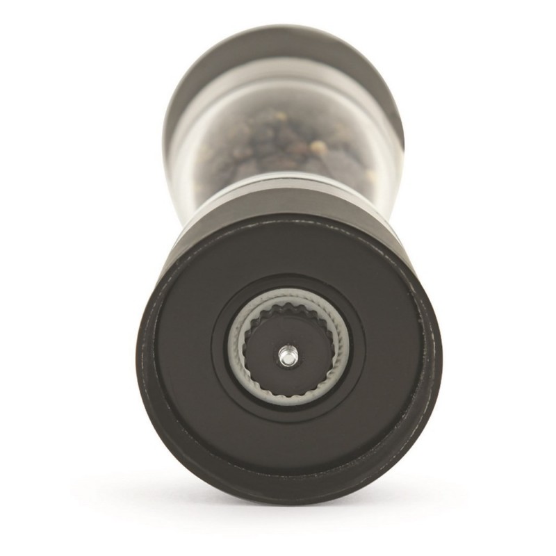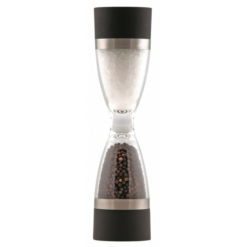 Moedor duplo projetado para moer sal e pimenta a seu gosto. Este moedor é facilmente recarregável e fabricado em acrílico com acabamento antiderrapante tanto na parte superior quanto na inferior.