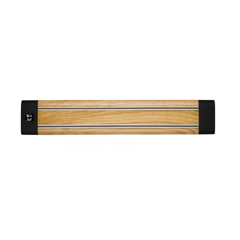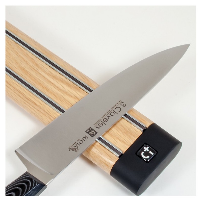 Barra magnética para facas de madeira de carvalho, projetada para economizar espaço e manter as facas organizadas e fora do alcance das crianças.