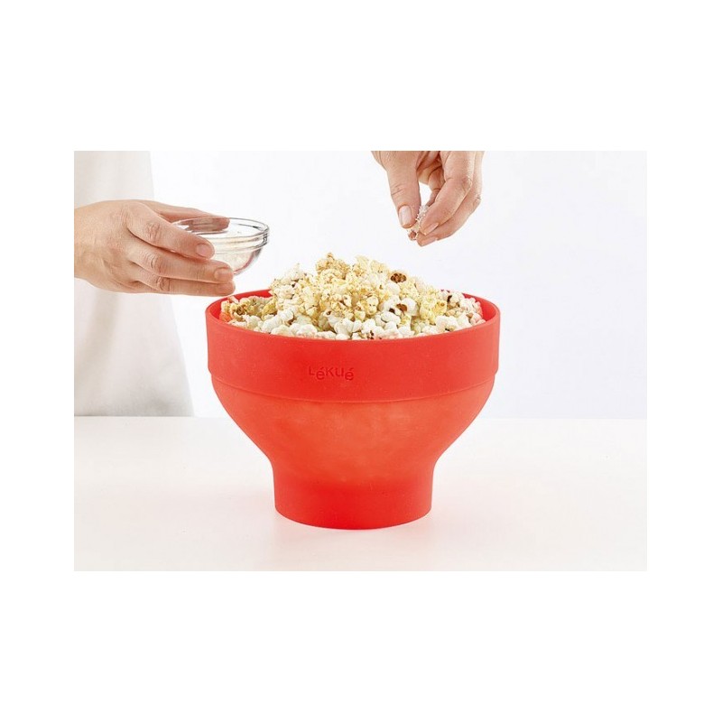 O Pop Corn é feito com silicone platina, com tampa transparente para que as pipocas não saltem, mas seja visível o interior, e em um design extremamente útil, uma vez que não só serve para cozinhar o milho, mas também como recipiente para comer pipocas, com uma forma que permite segurá-lo entre as pernas enquanto vê seu filme favorito ou lê aquele livro que tanto gosta. Mas o melhor de tudo é que uma vez que você precisa guardá-lo, o Pop Corn se dobra sobre si mesmo com apenas pressioná-lo com as mãos e o espaço que ocupa é menos da metade, o que é apreciado na hora de guardar recipientes da cozinha e que não se tornem um incômodo.