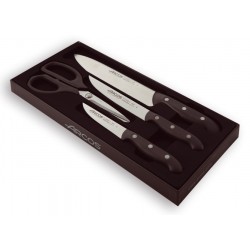 Jogo de cozinha da Arcos composto por 3 facas e tesouras da série Maitre.