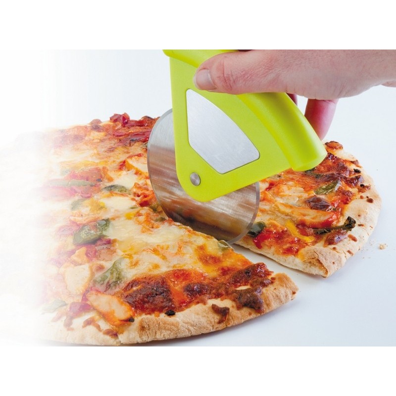 Cortador de pizza Roll In, roda de aço inoxidável e cabo de plástico resistente.