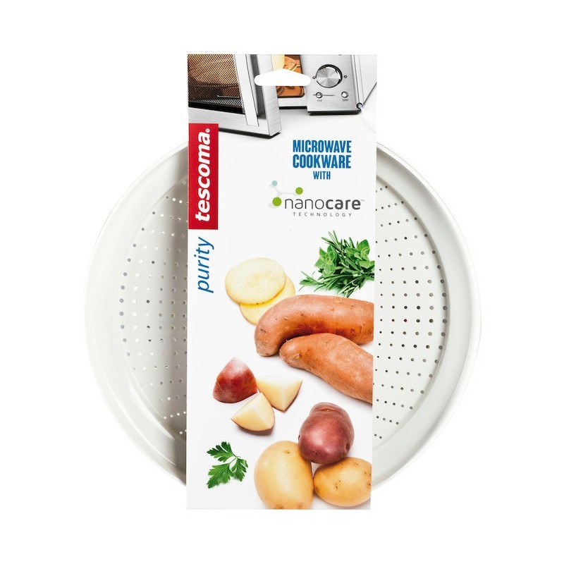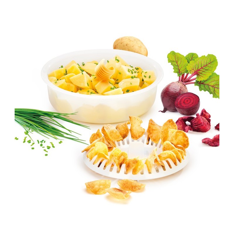 Recipiente projetado para cozinhar batatas e vegetais chips de maneira conveniente no microondas. Este recipiente é fabricado utilizando a tecnologia exclusiva nanoCARE, que utiliza plástico de qualidade médica e farmacêutica.