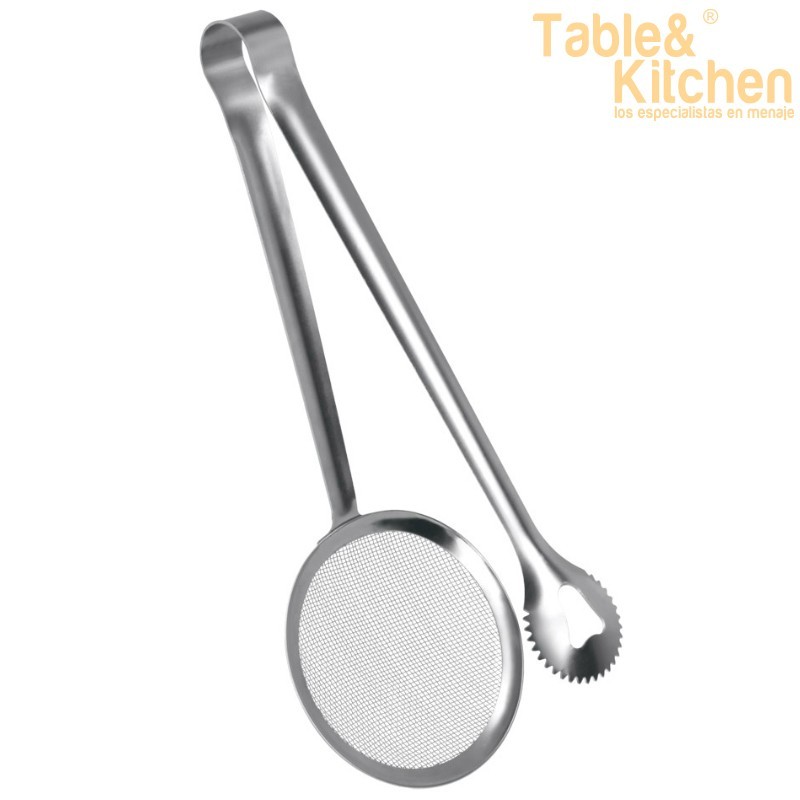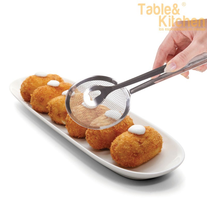 Pinça com malha fabricada em aço inoxidável para fritar e servir.
