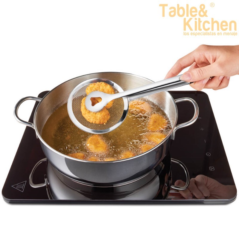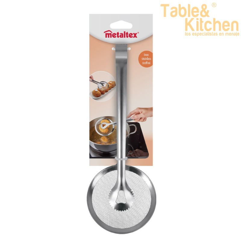 Pinça com malha 2 em 1, para fritar de maneira uniforme os alimentos, coar o excesso de óleo e servir confortavelmente.