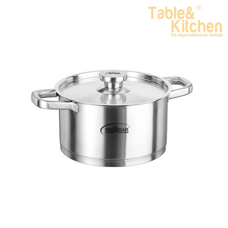 Caçarola alta Série Kook Me de Inoxibar, fabricada em aço inoxidável de alta qualidade com fundo difusor. Design moderno com linhas retas e acabamento fosco, adequada tanto para profissionais quanto para uso doméstico. Compatível com todo tipo de placas, incluindo indução, e apta para lava-louças.