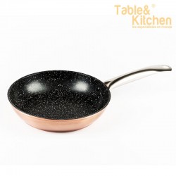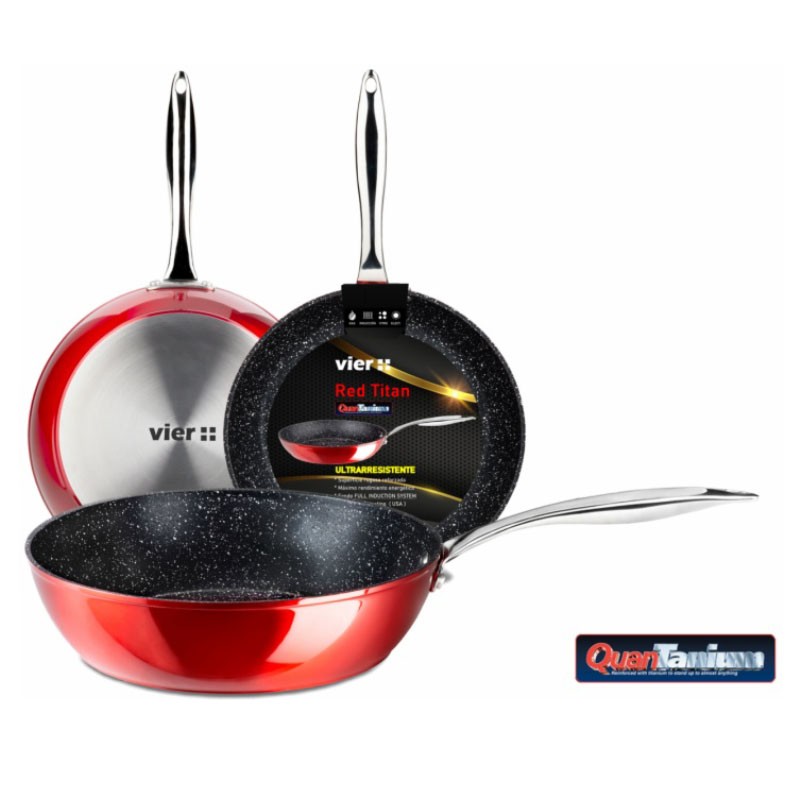 Frigideira alta fabricada em alumínio forjado de 2,8mm de espessura com base e cabo de aço inoxidável e cor exterior vermelha. Conta com um antiaderente reforçado com partículas de titânio livre de PFOA (Quantanium coating EUA), o que a torna ecológica e durável. Além disso, sua superfície antiaderente rugosa tipo pedra garante máxima antiaderência, resistência a abrasões e arranhões. Esta frigideira também conta com a característica de Full Induction, que permite uma máxima transmissão e distribuição do calor por toda a sua superfície. O cabo é fabricado em aço inoxidável e conta com triplo rebite. A frigideira é apta para forno e máquina de lavar louça.