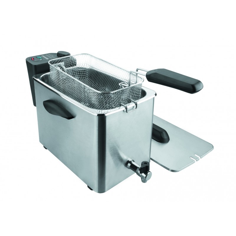 A fritadeira elétrica com torneira tem uma potência de 2500 W, uma capacidade de 4 litros e uma temperatura de 190ºC. Além disso, é totalmente desmontável para facilitar a limpeza, e sua torneira permite esvaziar a cuba sem esforço. Possui dimensões de 48 x 28 x 30 cm e um peso de 2,5 Kg.