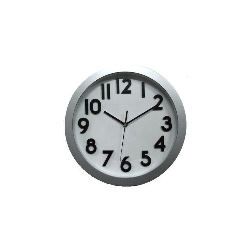 Relógio de parede com moldura cor prata e número em relevo. Fabricado em plástico.
