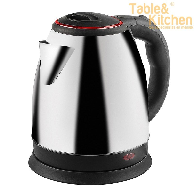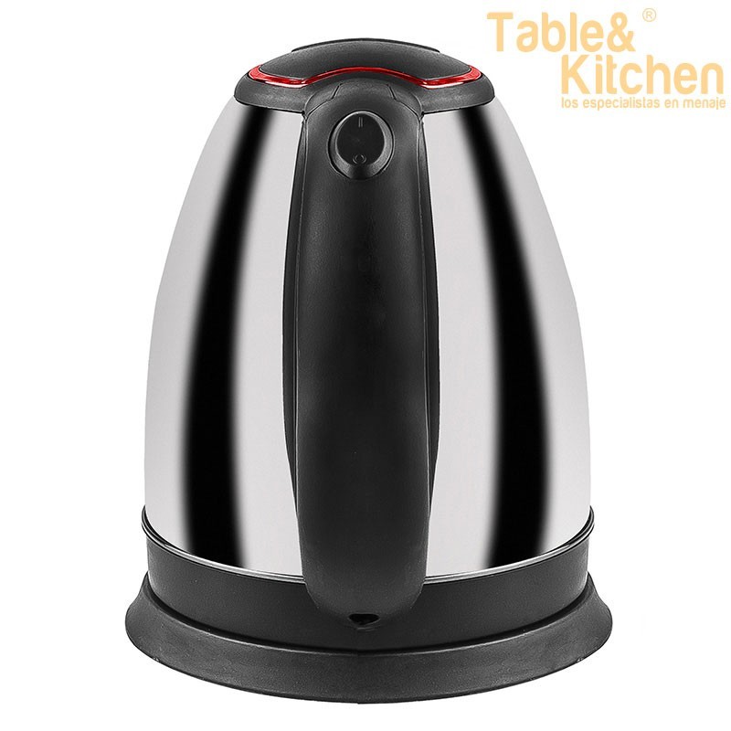 Chaleira Kuken com corpo exterior e interior em aço inoxidável e acabamento em aço inoxidável e PC preto. Possui uma alça ergonômica para uma melhor fixação e botão de ligar.