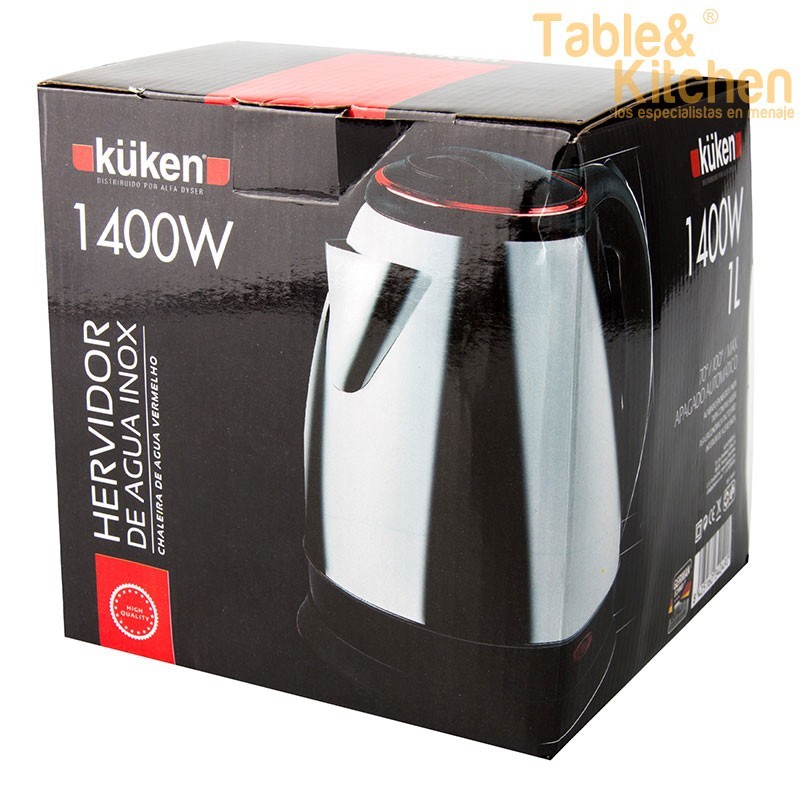 Chaleira Kuken, acabamento em aço inoxidável, 1400W e 1,5 Litros de capacidade. Ideal para preparar infusões, cafés solúveis, sopas instantâneas, mamadeiras para bebês, e mais.