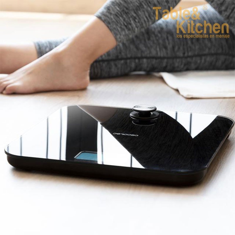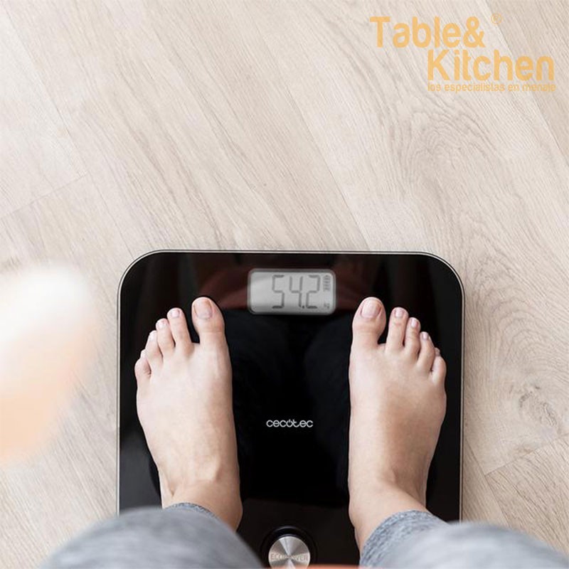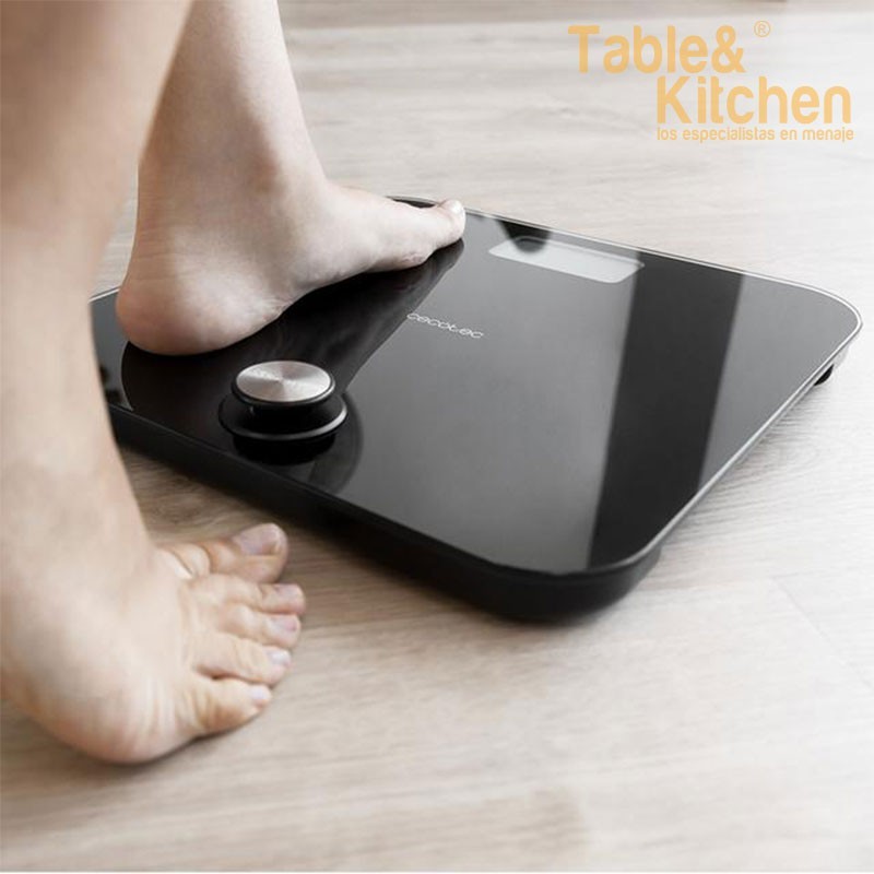 Balança de banho da Cecotec com botão, superfície de vidro temperado de alta segurança e sensores de precisão.