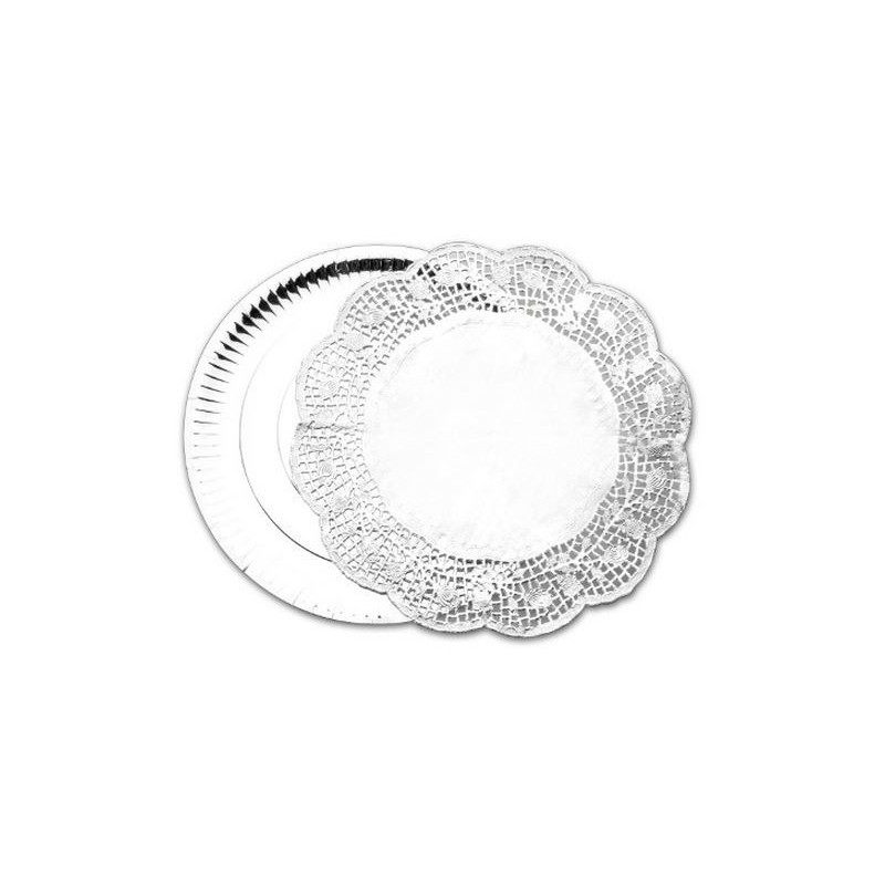 Conjunto de 3 bandejas + 3 blondas redondas na cor prata.