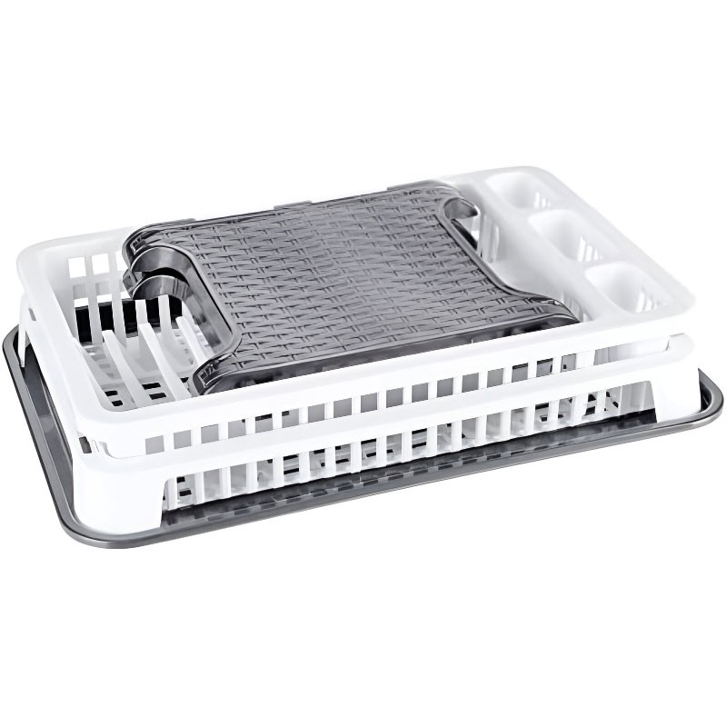 Mantenha sua cozinha organizada com elegância com este escorredor de pratos de dois andares com acabamento rattan. Ideal para espaços reduzidos, combina um design vertical eficiente com um visual moderno em branco e cinza que se encaixa em qualquer ambiente. Inclui bandeja inferior para coleta da água.