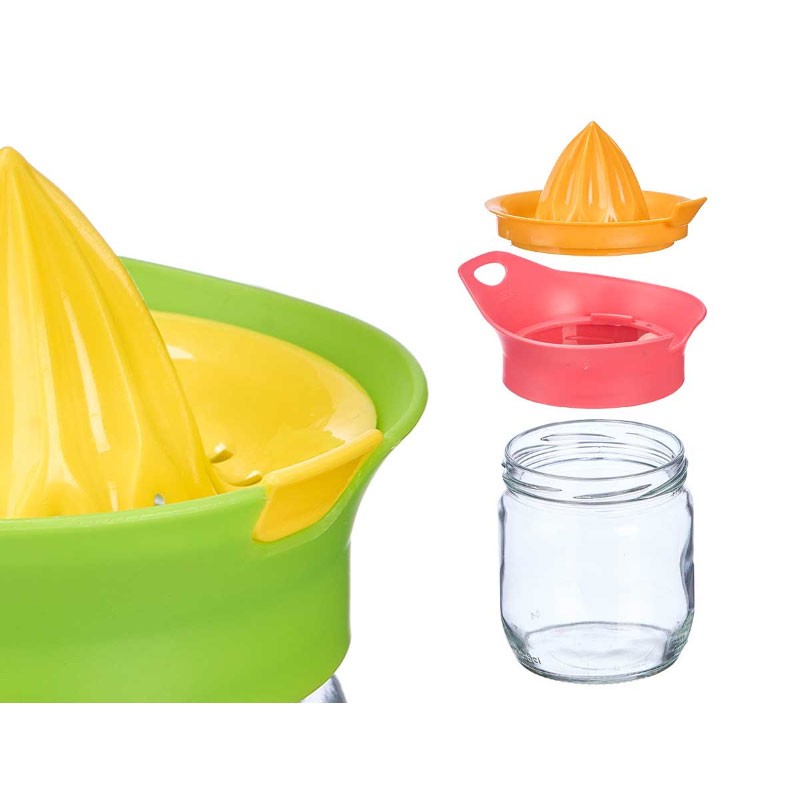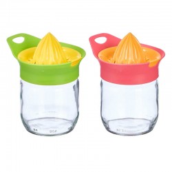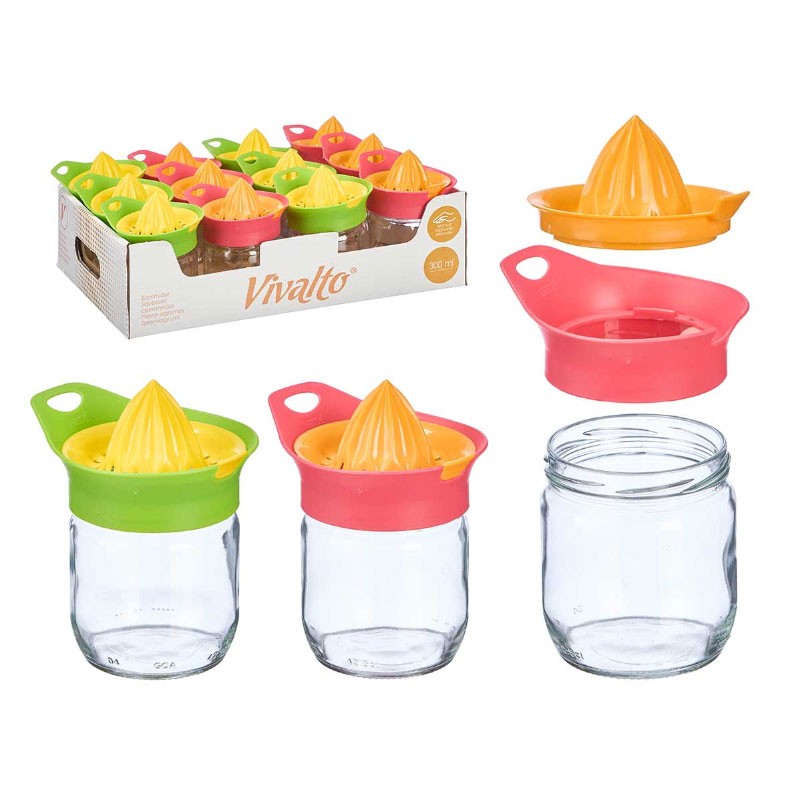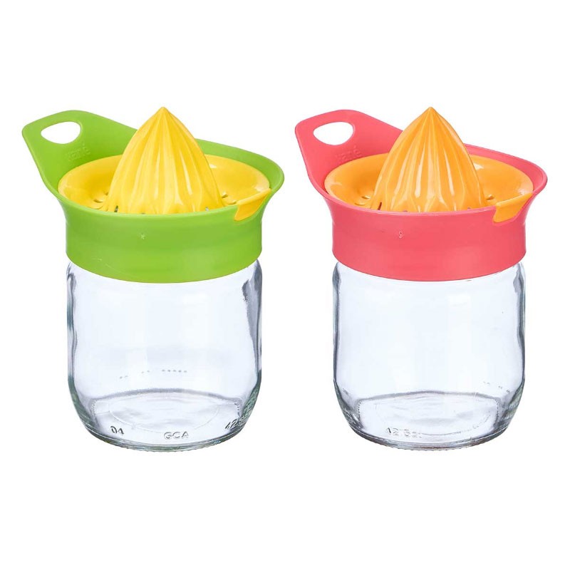 Fabricado em vidro resistente com espremedor em plástico (PP), este acessório combina durabilidade com funcionalidade. Está disponível em cores sortidas (amarelo-verde-transparente e laranja-vermelho-transparente), perfeitas para dar um toque alegre ao seu espaço.
