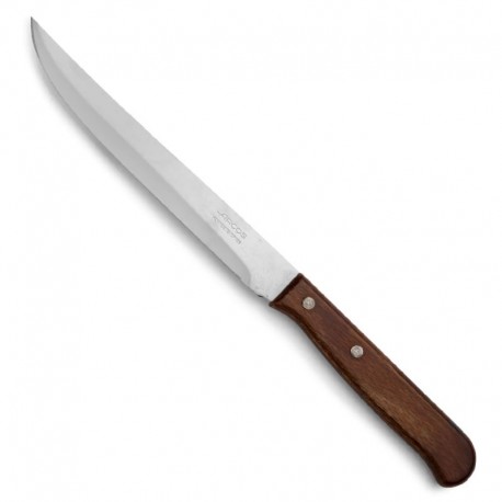 Lâmina de aço inoxidável e cabo de madeira comprimida.