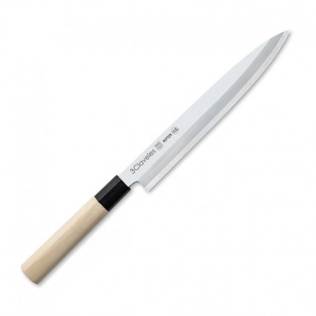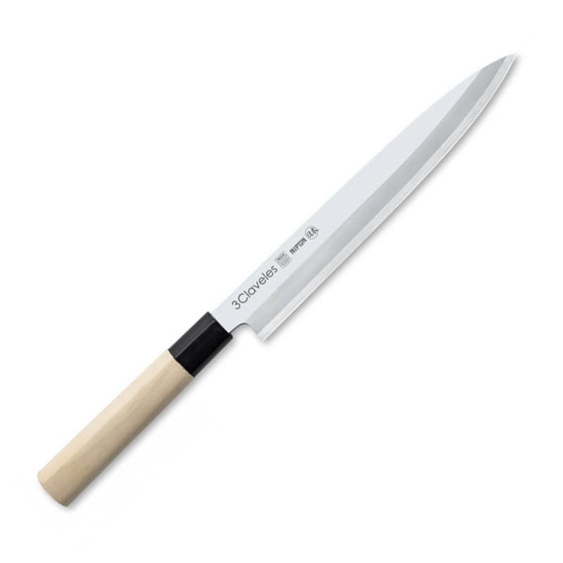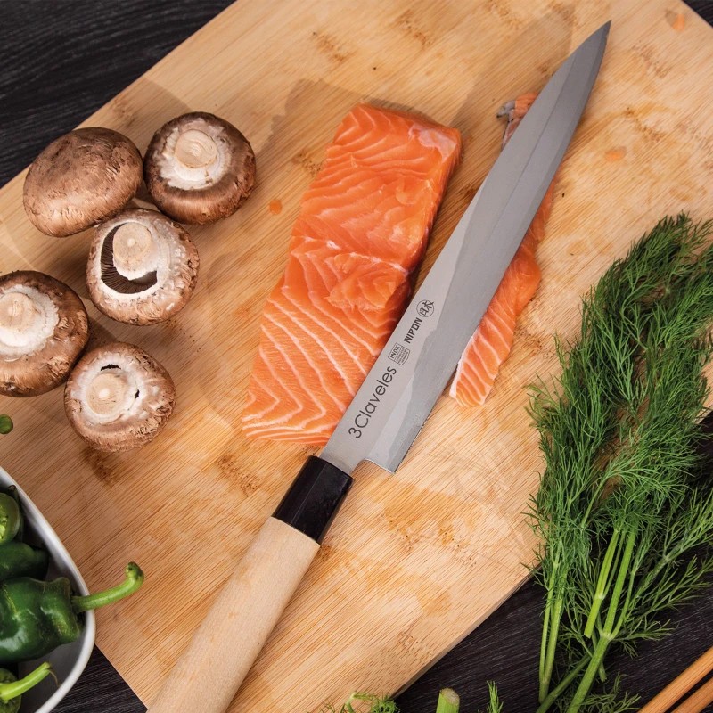 Faca japonesa, feita de aço de alta qualidade e madeira de bordo.