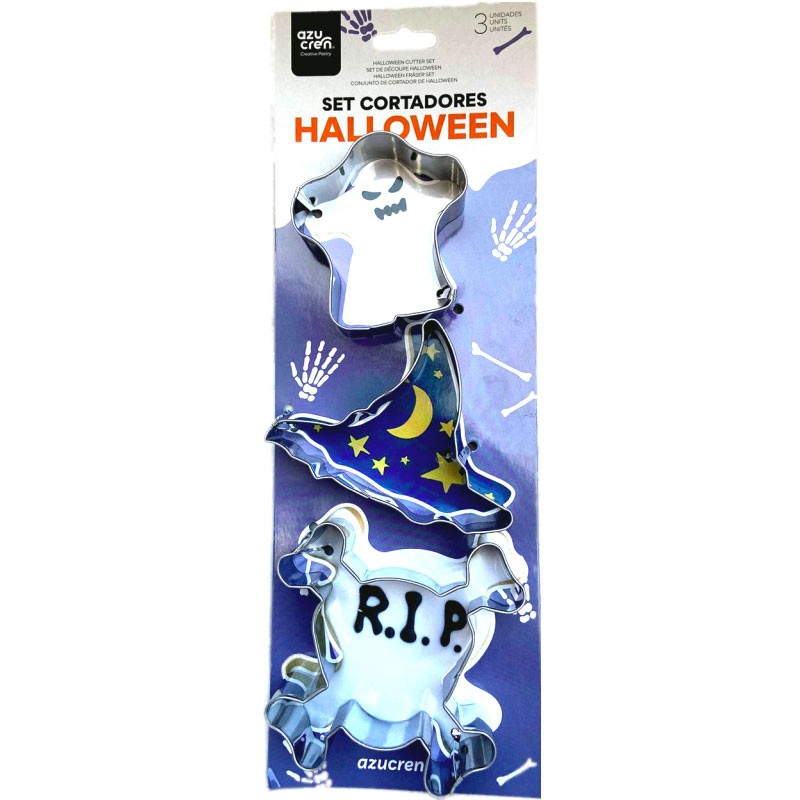 Conjunto de 3 cortadores de biscoitos com temática de Halloween.