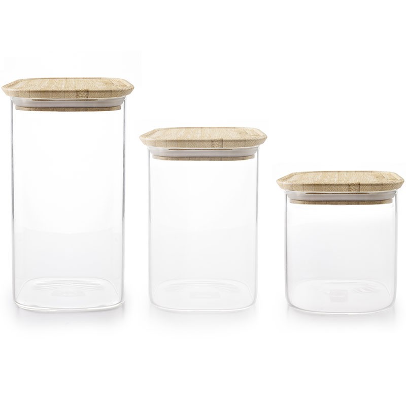 Pote para alimentos fabricado em vidro Borosilicato com tampa de bambu.