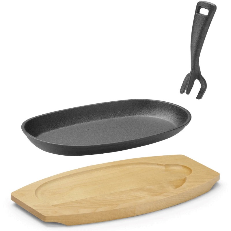 O conjunto completo de 3 peças inclui a travessa de ferro fundido, uma base de madeira de bétula que protege a superfície da mesa e adiciona um toque elegante, e um pegador removível que permite um manuseamento seguro e confortável mesmo com altas temperaturas.